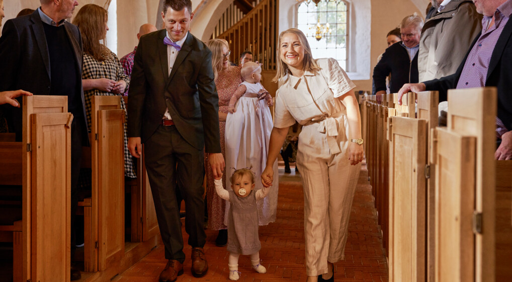 Klara gik selv ind i kirken, da hun skulle døbes i Skødstrup Kirke den 9. oktober 2021.