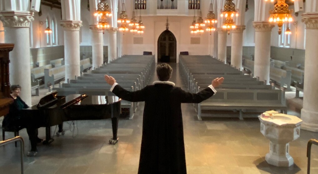Præst og organist forbereder digital gudstjeneste fra Sankt Jakobs Kirke, Østerbro. Arkivfoto.