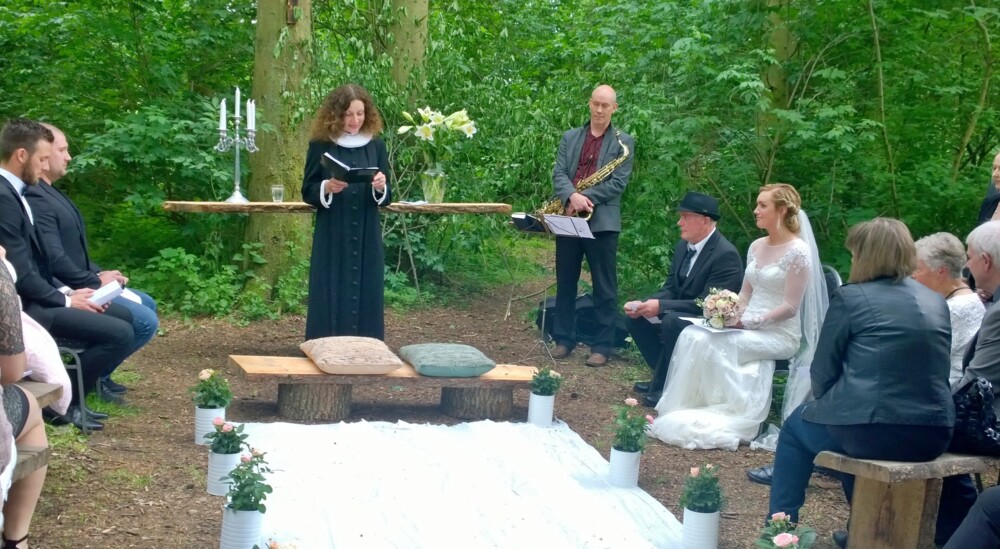 Maja og Thomas blev kirkeligt velsignet i skovkanten af sognepræst Pernille Hornum. Privatfoto. Se flere fotos fra brylluppet i længere nede.