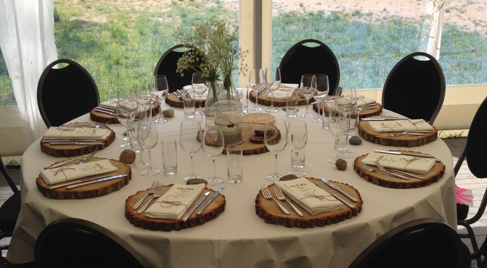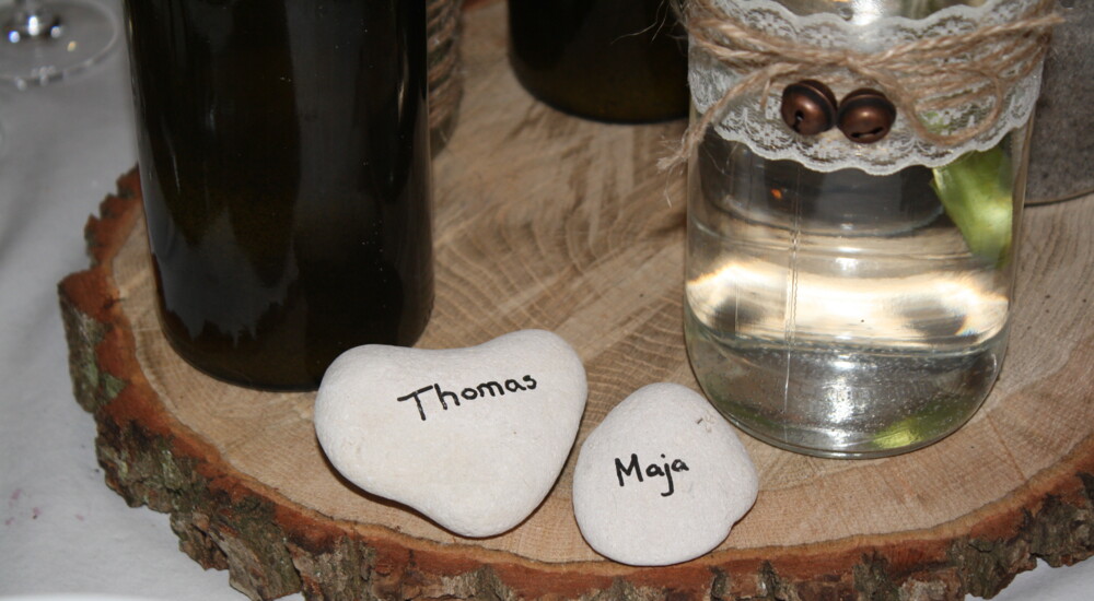 Bordpynten var flasker, der var spraymalet guld og blomsterne blev plukket i nærheden. Bordkortene var sten, de havde fundet ved vandet og skrevet gæsternes navne på.