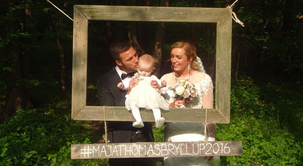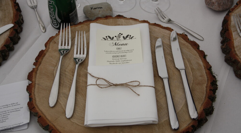 Både Maja og Thomas har hænderne godt skruet på, og det hjalp, da de ville forene det personlige med at holde sig inden for budgettet. Thomas er uddannet tømrer og bygningskonstruktør, og Maja er grafiker, så hun kreerede invitationer og bordkort.