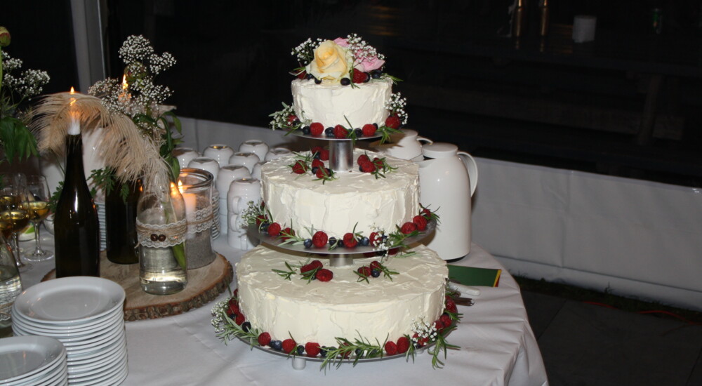 Bryllupskagen blev bagt af en, Maja fandt på Facebook, og maden stod Majas bror, der er kok, for. Drikkevarerne købte parret i Tyskland.