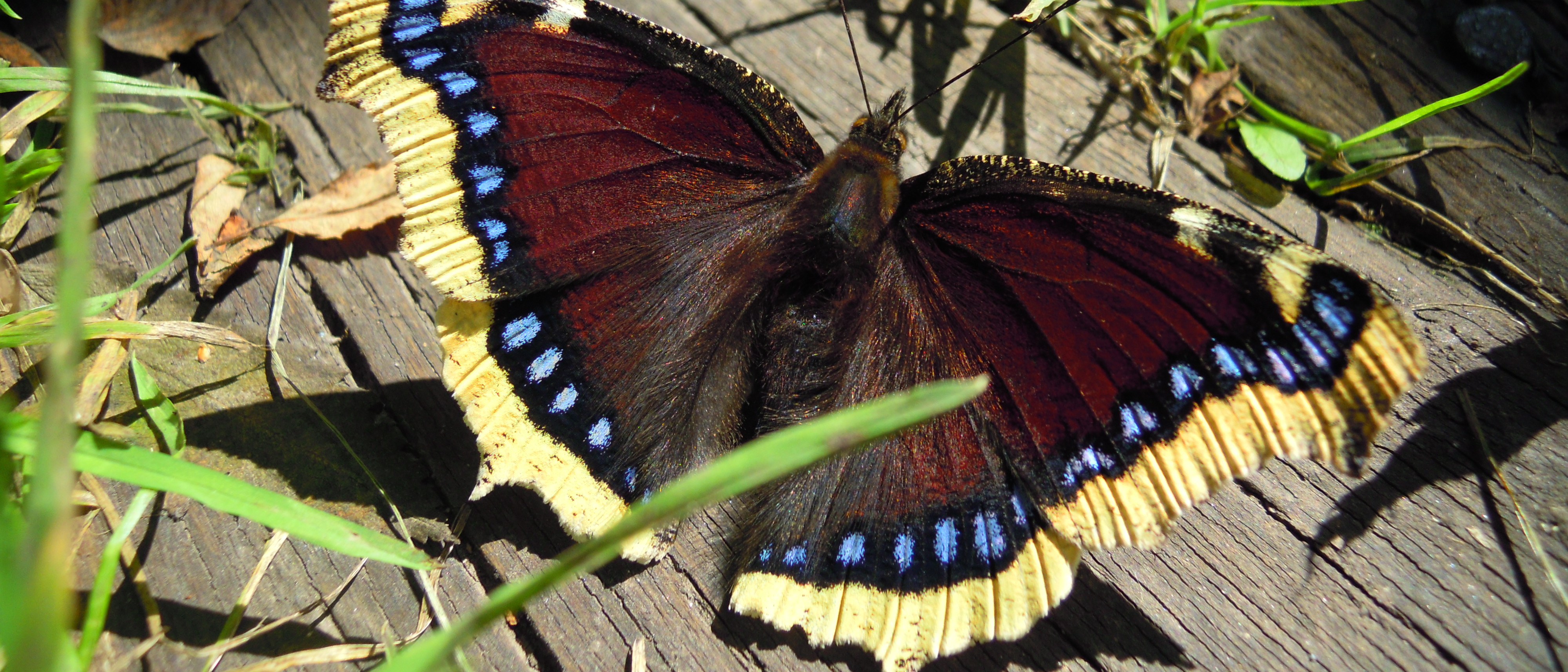 Sommerfuglen Sørgekåbe er dybviolet med klare blå prikker og en lys gul yderste kant. ”Men,” skriver Mikkel Frey Damgaard, ”de blå pletter og den gule kant vidner også om, at der findes noget andet under kåben.”