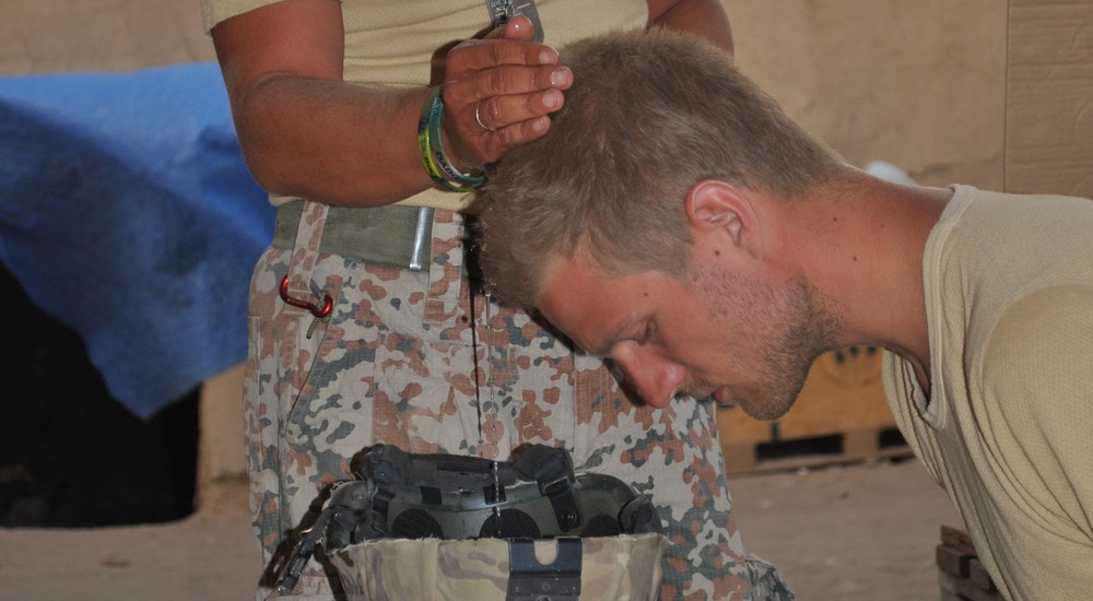 En soldat bliver døbt. Man må tænke alternativt, når man ikke har en døbefont i nærheden, så her tages soldaterhjelmen i brug.